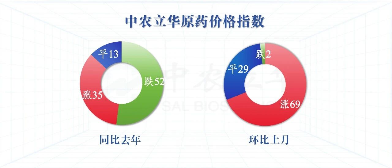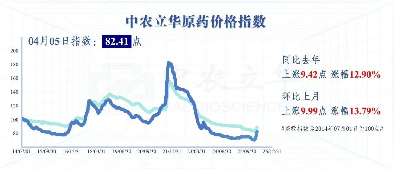 2026年4月5日,中农立华原药价格指数报82.41点,同比去年上涨12.90%,环比上月上涨13.79%。跟踪的上百个产品中,同比去年52%产品下跌,13%产品持平,35%产品上涨;环比上月2%产品下跌,29%产品持平,69%产品上涨。