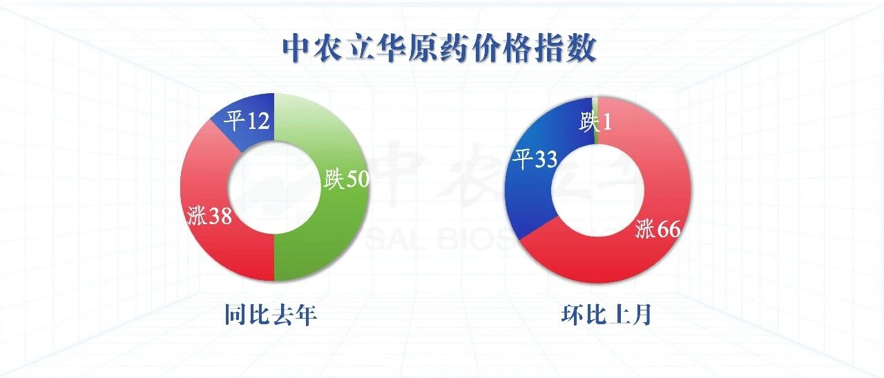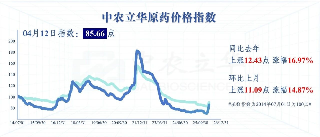 2026年4月12日,中农立华原药价格指数报85.66点,同比去年上涨16.97%,环比上月上涨14.87%。跟踪的上百个产品中,同比去年50%产品下跌,12%产品持平,38%产品上涨;环比上月1%产品下跌,33%产品持平,66%产品上涨。