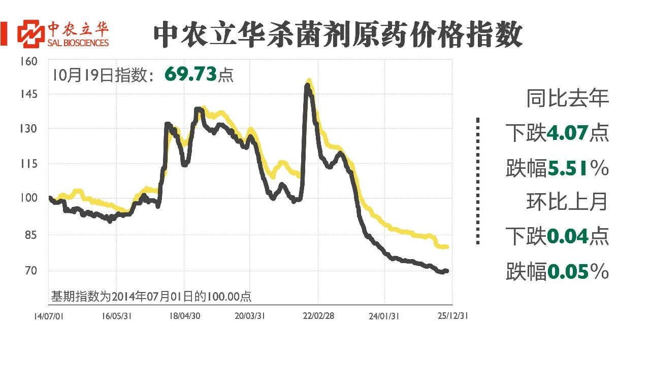 2025年10月19日,中农立华杀菌剂原药价格指数报69.73点,同比去年下跌5.51%,环比上月下跌0.05%。