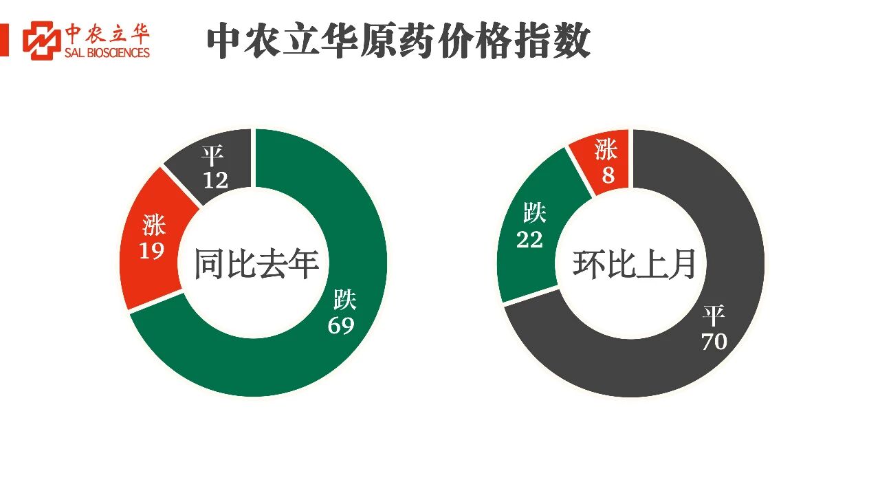 2025年10月19日,中农立华原药价格指数报74.73点,同比去年下跌0.09%,环比上月下跌0.08%。跟踪的上百个产品中,同比去年69%产品下跌;环比上月70%产品持平,8%产品上涨。